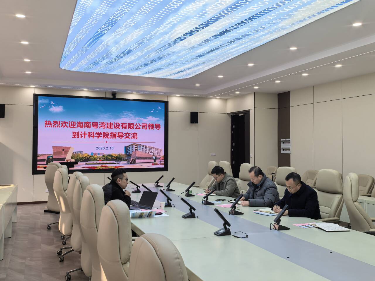 2月10日上午,海南粤湾建设有限公司CEO杨兴华到访437437必赢国际。学校党委常委、副校长聂祥飞、计科学院李洪兵、马龙、周政等老师在慎思楼三栋306会议室与来访企业进行了交流,双方围绕产教融合、实验室共建、校企合作等方面进行了深入的探讨。