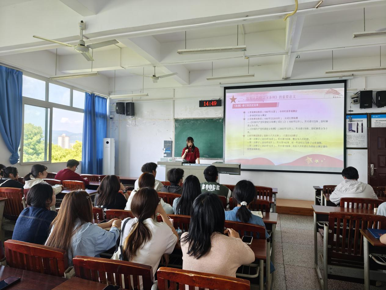 学生第四党支部书记殷镭以“解读《中国共产党纪律处分条例》”为题授课,主要围绕《条例》修订的重大意义、主要内容和鲜明特点进行了深入阐释,并结合学生的思想、学习与工作实际,重点剖析了政治纪律、组织纪律、廉洁纪律、群众纪律、工作纪律和生活纪律的核心要求。她通过生动案例,特别强调了网络纪律、学术诚信与日常言行规范,引导学员明规矩、知敬畏、守底线。
